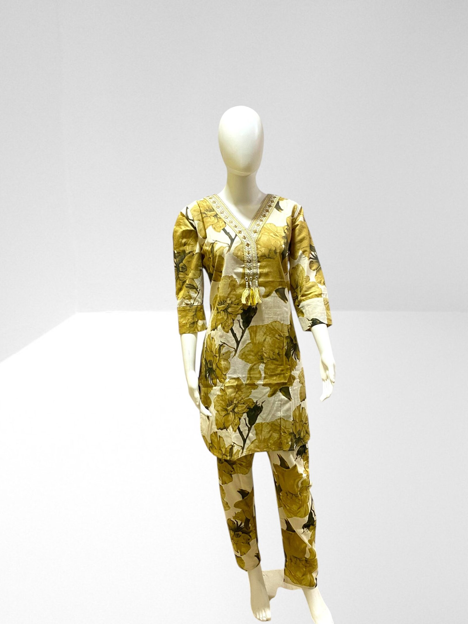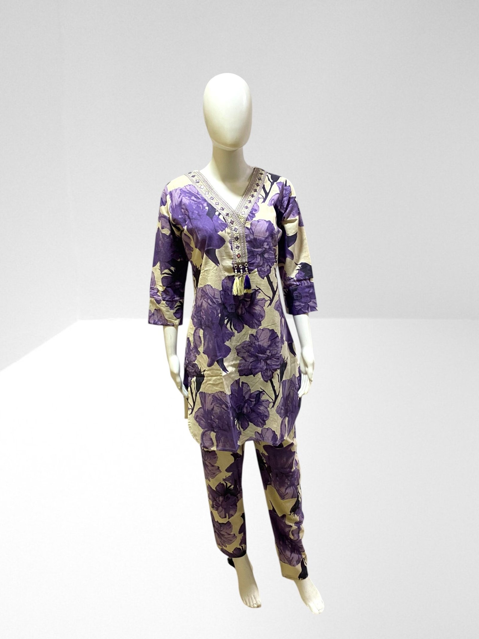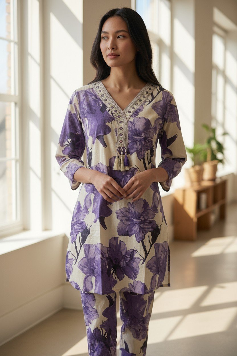 Co-ord Sets for Women, V Neck, quarter regular sleeves, Cotton Co-ord Set, Floral Pattern, Regular fit, Tunic and straight pant set.